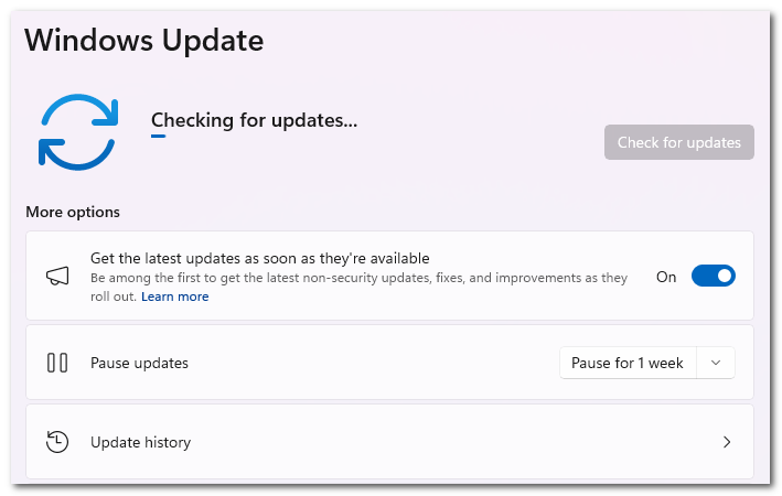 Cómo quería echarles un vistazo, activé la opción “Get Windows updates as soon as they’re available” (Obtenga actualizaciones de Windows tan pronto como estén disponibles) y procedí a comprobar las actualizaciones: